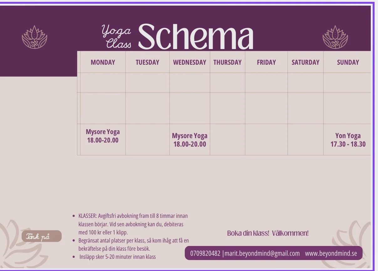 Mysore är kärnan i Ashtangayoga – ett enkelt och traditionellt sätt att lära sig yoga i egen takt. Du följer en fast sekvens av rörelser, och när du är redo lägger du till nya positioner. Praktiken växer naturligt och anpassas helt efter dig.